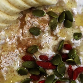 - Spoon half of the mixture into a second bowl, then top both with the rest of the banana, goji berries, pumpkin seeds, 1/2 tsp